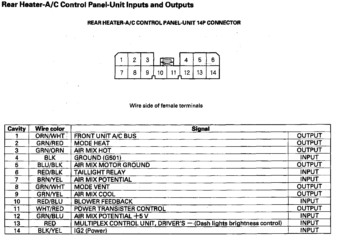 Rear Heater-A/C Control Panel-Unit Inputs And Outputs: