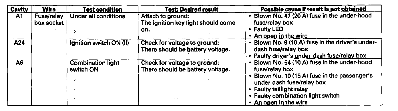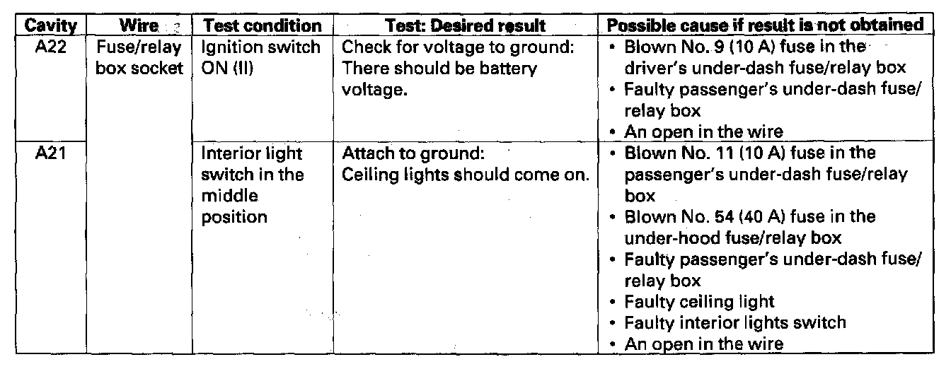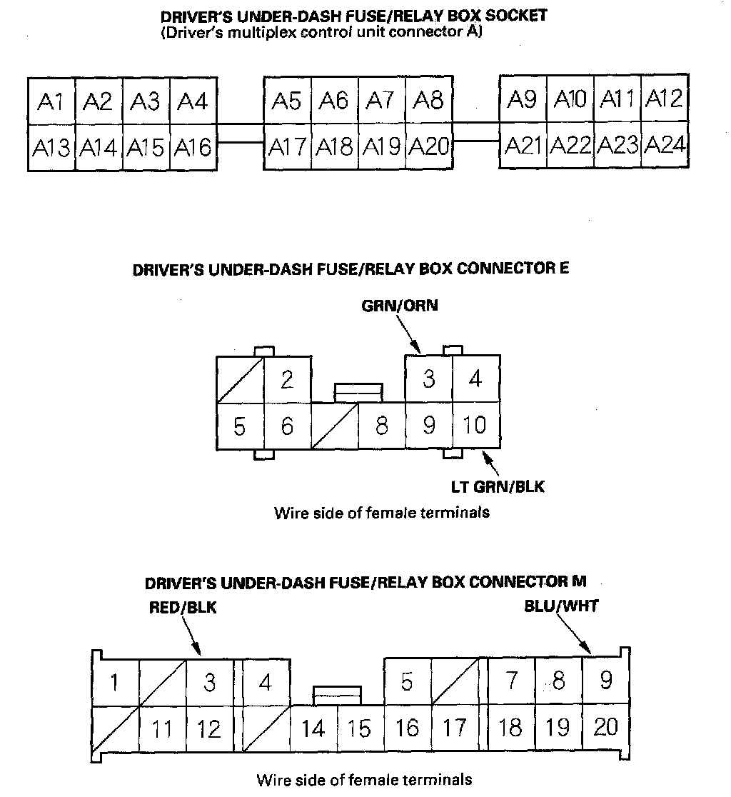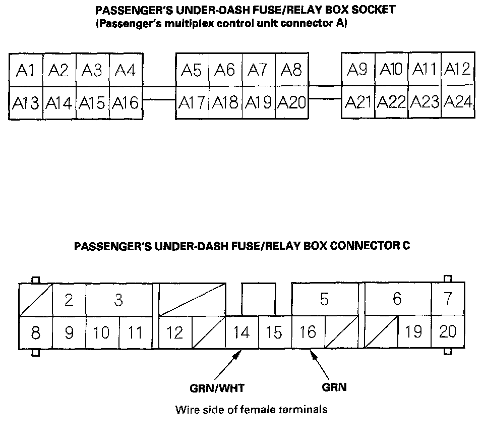 8. With the passenger's multiplex control unit still disconnected, make these input tests at the connector and passenger's under-dash fuse/relay box socket.