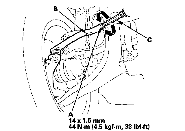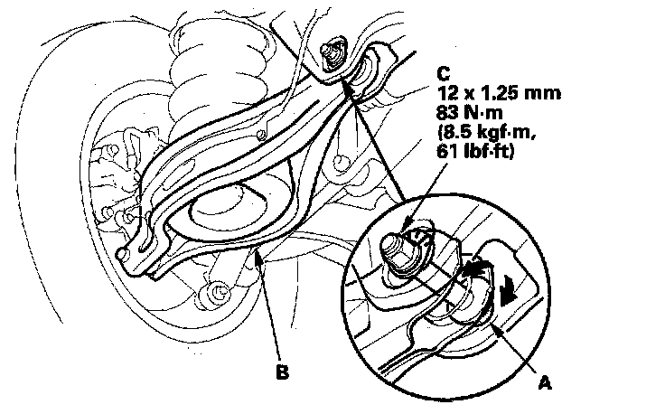 3. Hold the adjusting bolt (A) on the rear lower arm B, and loosen the self-locking nut (C).