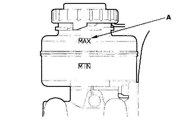 1. Make sure the brake fluid level in the reservoir is at the MAX (upper) level line (A).