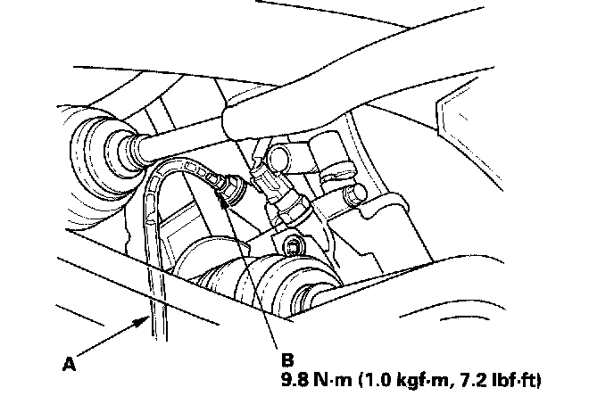 4. Install a rubber hose (A) on the drain bolt (B) located at the rear of the engine block, then loosen the drain bolt.