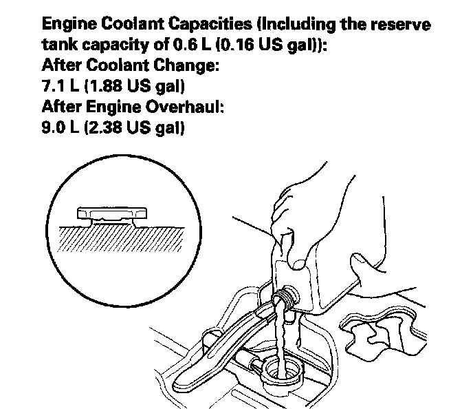 12. Check the level in the radiator, and add Acura Long Life Antifreeze/Coolant Type 2, if needed.