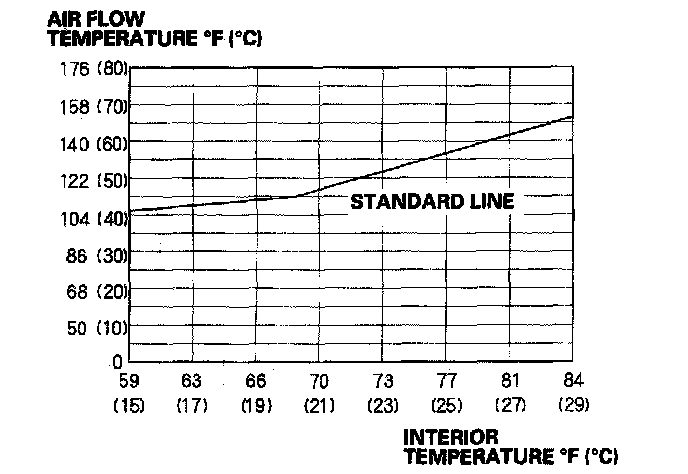 21. Set the climate control or heater control panel to maximum heat, and select high speed heat mode on the rear control panel. Measure the temperature of the air from the rear floor vent for 2 or 3 minutes. Make sure the temperature is above the standard line of the graph as shown. If the temperature is below the standard line, repeat steps 15 through 18 several more times. Then loosely install the radiator cap and recheck.