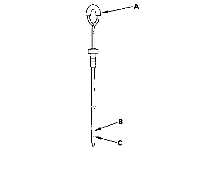 5. Remove the dipstick (A) and check the fluid level. It should be between upper mark (B) and lower mark (C).