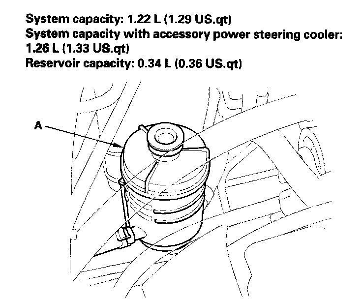 Fluid ReplacementCheck the reservoir (A) at regular intervals, and add the recommended fluid as necessary. Always use Honda Power Steering Fluid. Using any other type of power steering fluid or automatic transmission fluid can cause increased wear and poor steering in cold weather.