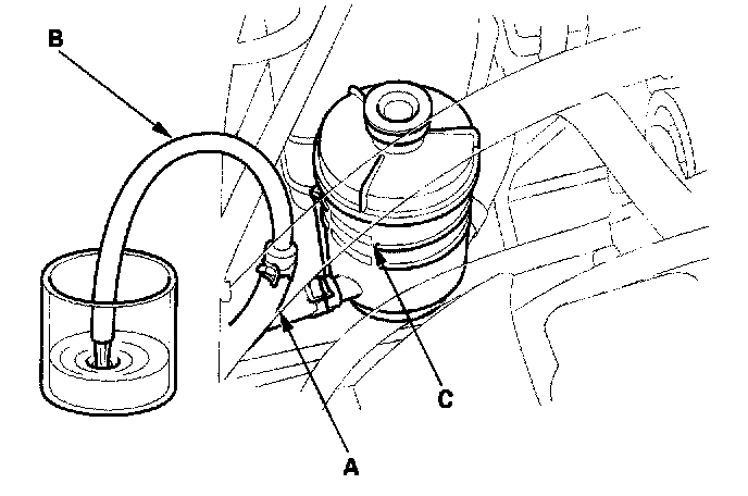 1. Remove the power steering reservoir from its holder. Raise the reservoir, then disconnect the return hose (A) to drain the reservoir. Take care not to spill the fluid on the body and parts. Wipe off any spilled fluid at once.