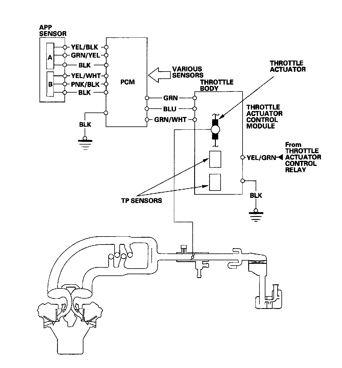 The Electronic Throttle Control System consists of the throttle actuator, throttle actuator control module, throttle actuator control relay, throttle position (TP) sensors, accelerator pedal position (APP) sensor, and the PCM. The throttle is electronically controlled by this system.