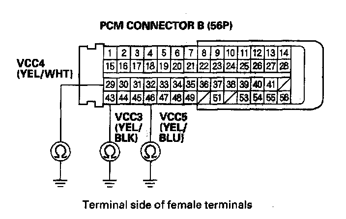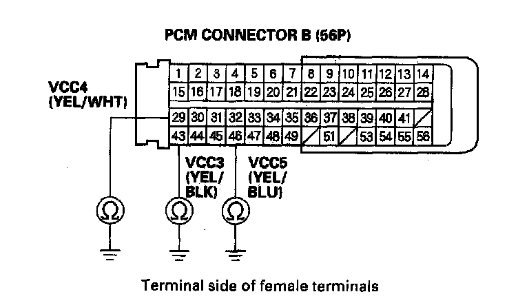 17. Disconnect the connector from each of these sensors, one at a time, and check for continuity between body ground and PCM connector terminal A7, A27, B29, B43, and B46 individually.