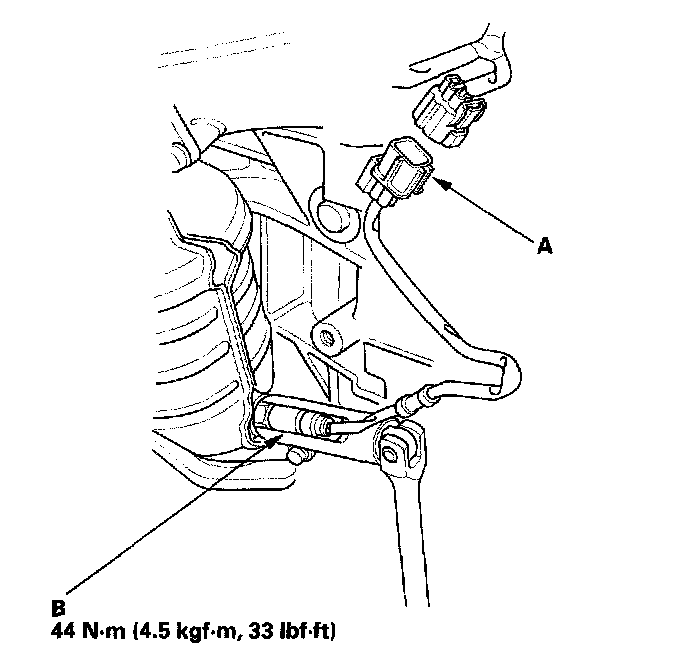 1. Disconnect the front secondary HO2S 4P connector (A), then remove the front secondary HO2S (B).