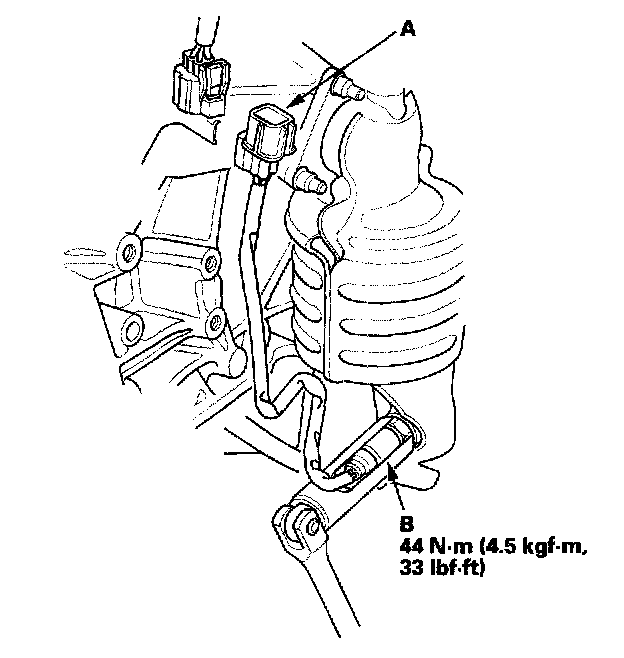 1. Disconnect the rear secondary HO2S 4P connector (A), then remove the rear secondary HO2S (B).