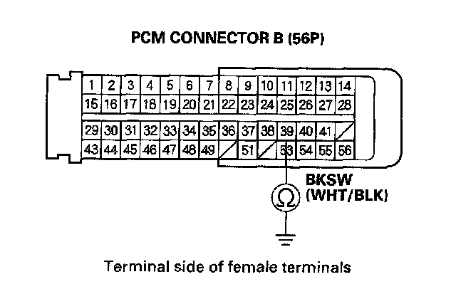 14. Check for continuity between PCM connector terminal B39 and body ground with the brake pedal pressed.