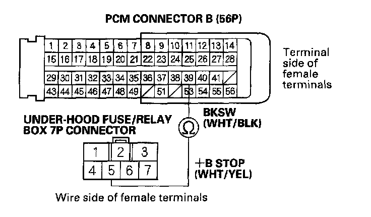 15. Check for continuity between PCM connector terminal B39 and under-hood fuse/relay box 7P connector terminal No.5 with the brake pedal pressed.