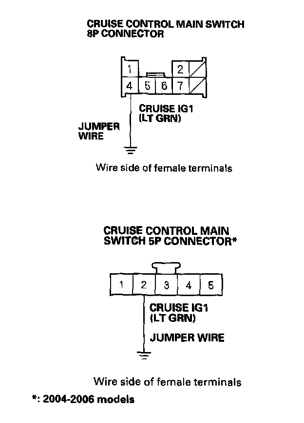 22. Connect cruise control main switch 8P (5P*) connector terminal No.4 (No.2*) to body ground with a jumper wire.