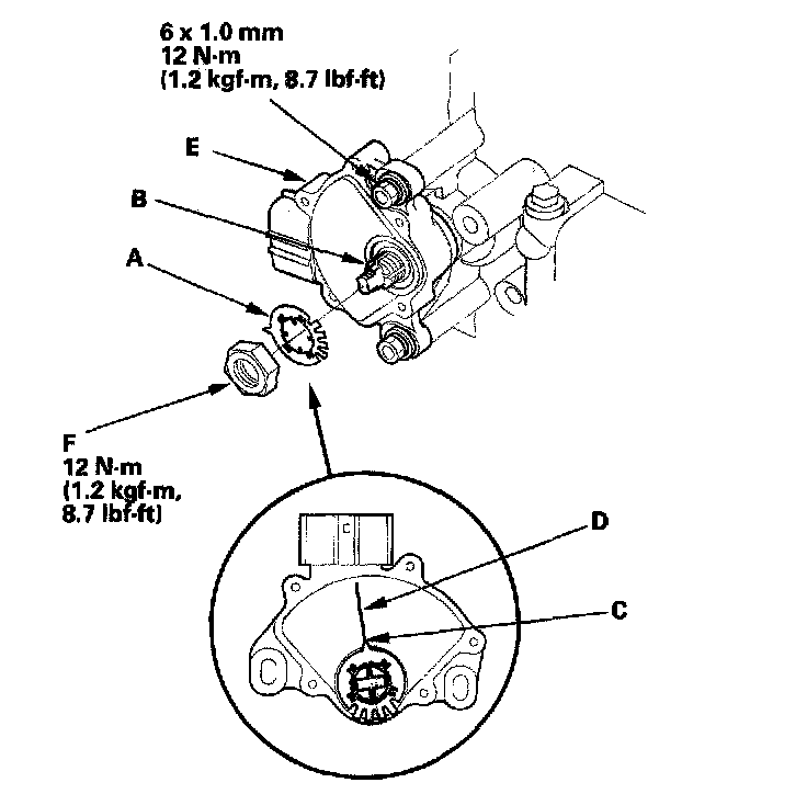 13. Install the new lock washer (A) over the selector control shaft (B) with aligning the projection (C) of the lock washer with the N positioning line (D) on the transmission range switch (E), and install the locknut (F).
