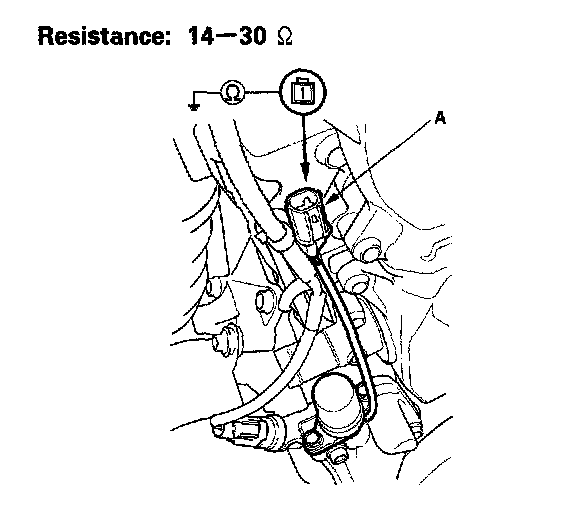 2. Measure resistance between the rocker arm oil control solenoid (VTEC solenoid valve) 1P connector terminal (A) and body ground.