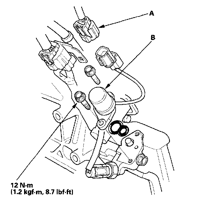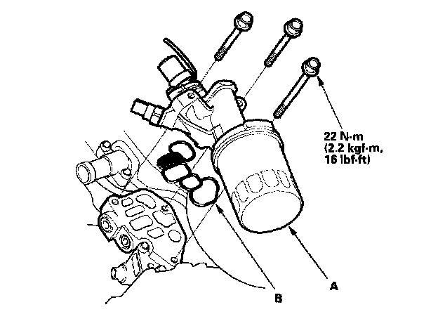 3. Remove the rocker arm oil control solenoid (VTEC solenoid valve)/oil filter assembly (A) from the oil pump, and check the rocker arm oil control solenoid (VTEC solenoid valve) filter (B) for clogging. If there is clogging, replace the rocker arm oil control solenoid (VTEC solenoid valve) filter, the engine oil filter, and the engine oil.