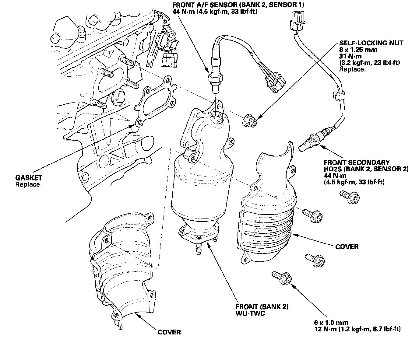 4. Install the front (Bank 2) WU-TWC, and tighten the nuts in a crisscross pattern in two or three steps