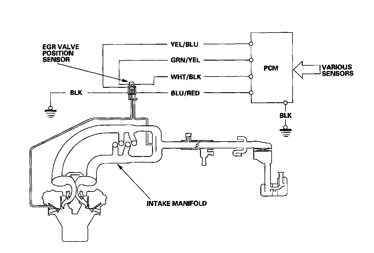 The EGR valve position sensor detects the amount of EGR valve lift and sends it to the PCM. The PCM then compares it with the ideal lift in its memory (based on signals sent from other sensors). If there is any difference between the two, the PCM cuts current to the EGR valve.