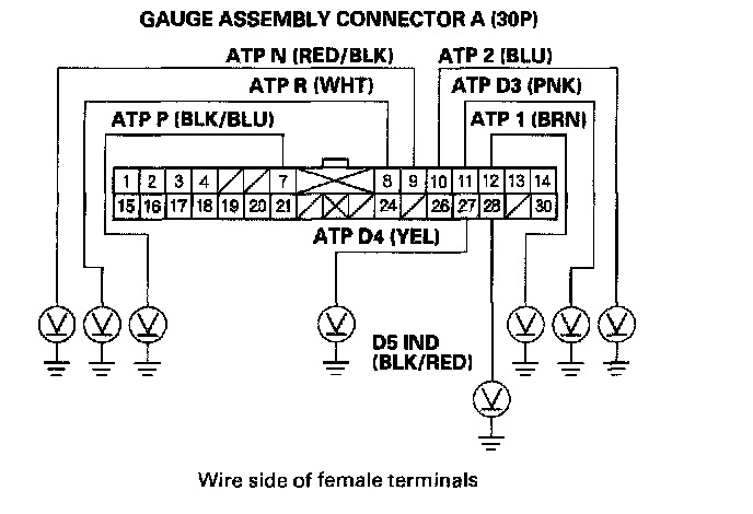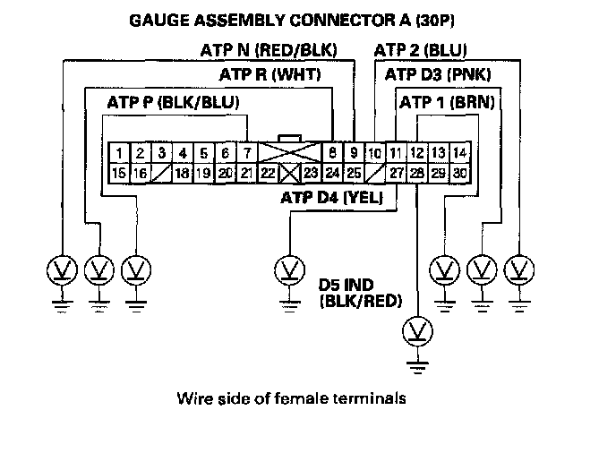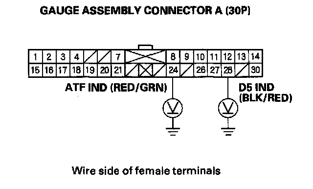 6. Move the shift lever into the D5 position, and check for voltage between gauge assembly connector terminal A28 (BLK/RED) and body ground. There should be battery voltage in the D5 position, and there should be 0 Volts in any position other than the D5.