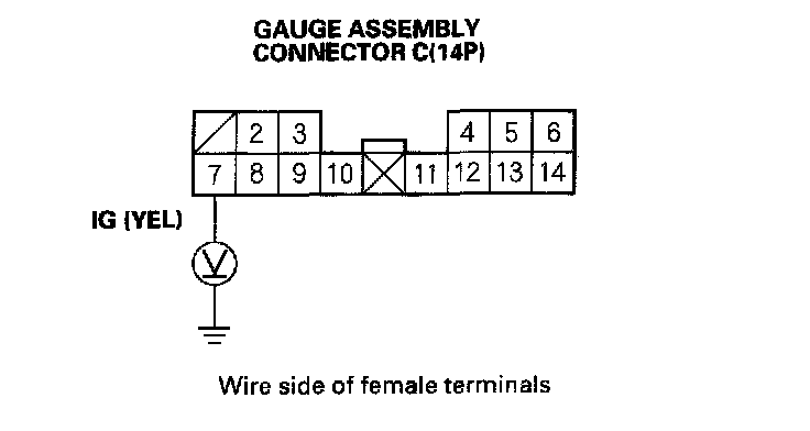 8. Check for voltage between gauge assembly connector terminal C10 (YEL) and body ground with the ignition switch turned ON (II). There should be battery voltage. If there is no voltage, check for a blown No. 9 (10 A) fuse in the driver's under-dash fuse/relay box or an open in the wire.