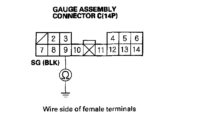9. Turn the ignition switch OFF, and check for continuity between terminal C9 (BLK) and body ground. There should be continuity to ground under all conditions. If there is no continuity, check for an open in the wire, or poor ground (G501).