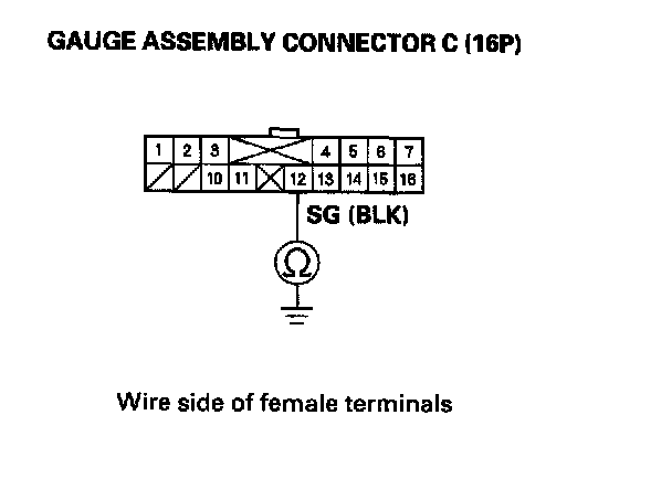 9. Turn the ignition switch OFF, and check for continuity between connector terminal C12 (BLK) and body ground. There should be continuity to ground under all conditions. If there is no continuity, check for an open in the wire, or poor ground (G501).