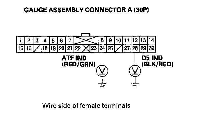 6. Move the shift lever into the D5 position, and check for voltage between gauge assembly connector terminal A28 (BLK/RED) and body ground. There should be about 5 Volts in the D5 position. There should be 0 Volts in any other shift lever position.
