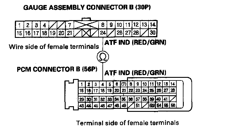 10. Check for continuity between PCM connector terminal B4 and gauge assembly connector terminal A24.