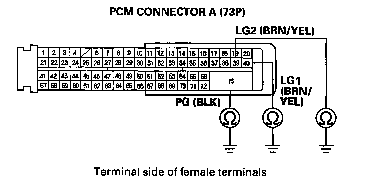 11. Check for continuity between PCM connector terminals A39 and body ground, between A40 and body ground, and between A73 and body ground.
