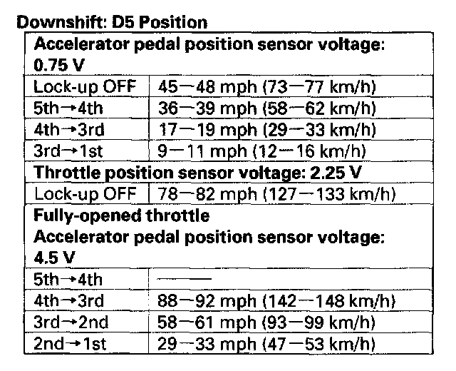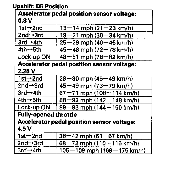 5. Test-drive the vehicle on a flat road in the D5 position, Check for abnormal noise and clutch slippage. While driving, check that the shift points occur at the proper speeds by monitoring the throttle position sensor voltage with the HDS and comparing your shift point speeds and voltage to those in the table. (The Accelerator pedal position sensor voltage represents the throttle opening.)