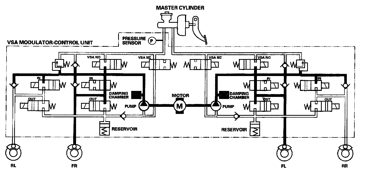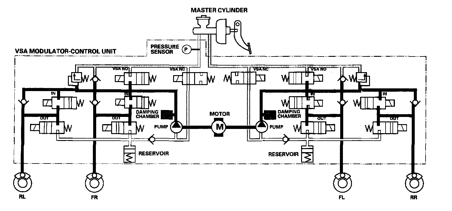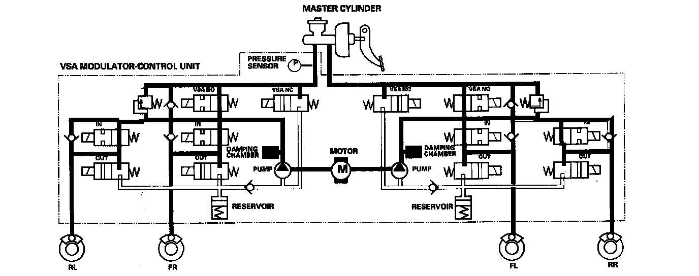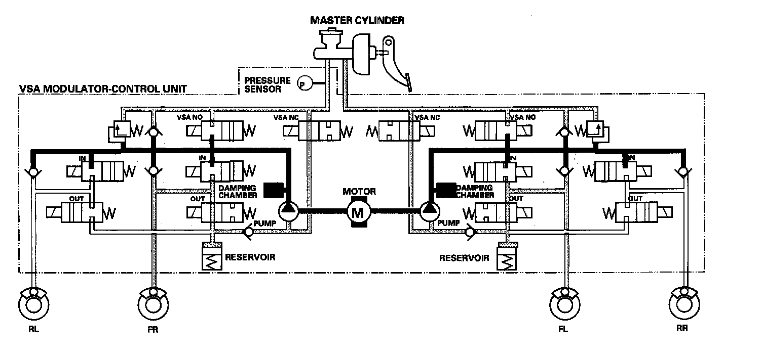 The reservoir and master cylinder fluid is pumped out by the pump, through the damping chamber, to the front and rear calipers.