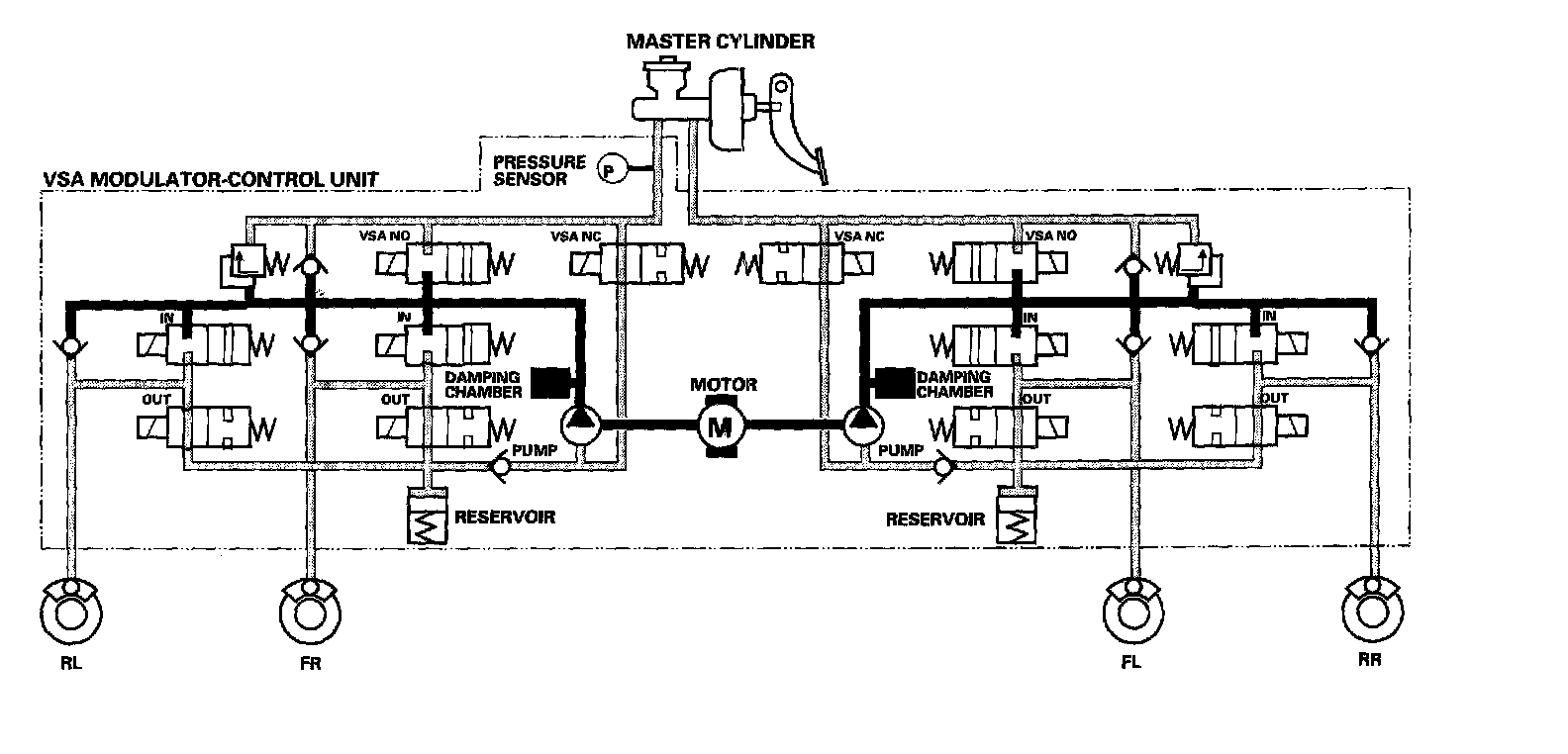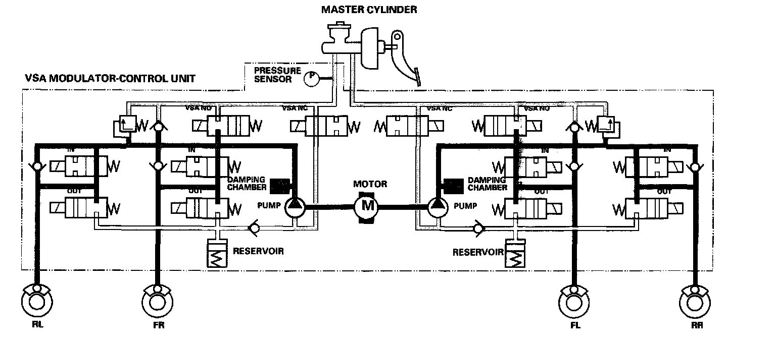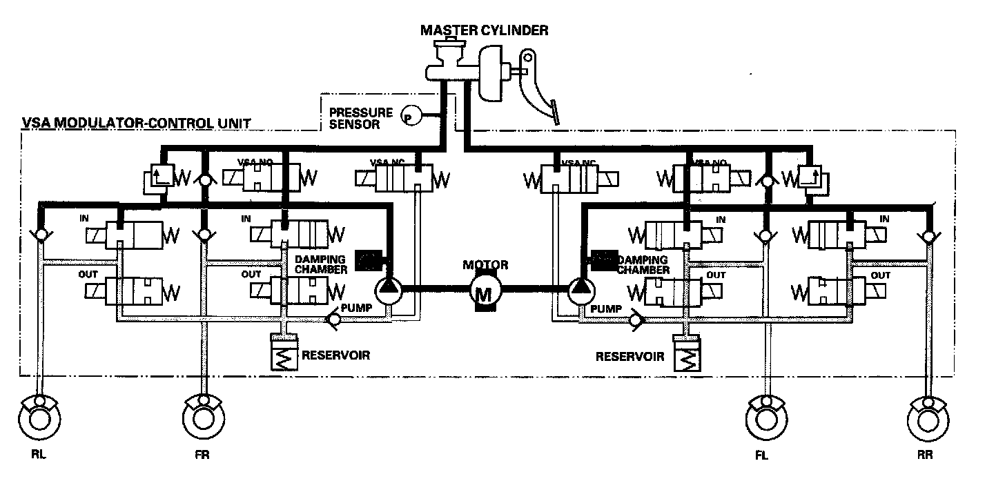 The reservoir and master cylinder fluid is pumped out by the pump, through the damping chamber, to the front and rear calipers.