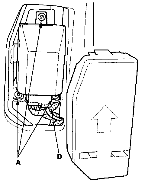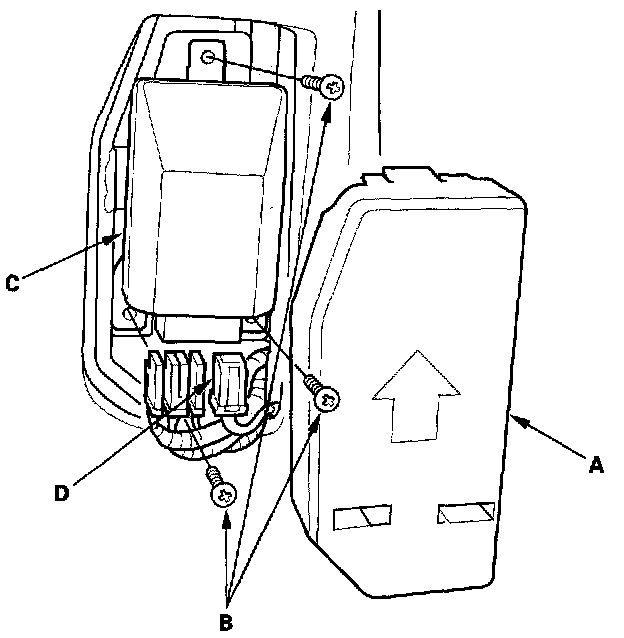 1. Place the new OPDS unit on the front passenger's seat-back frame. Tighten the three screws (A), and connect the OPDS unit harness 8P connector D and sensor connectors to the OPDS unit. Reinstall the cover.