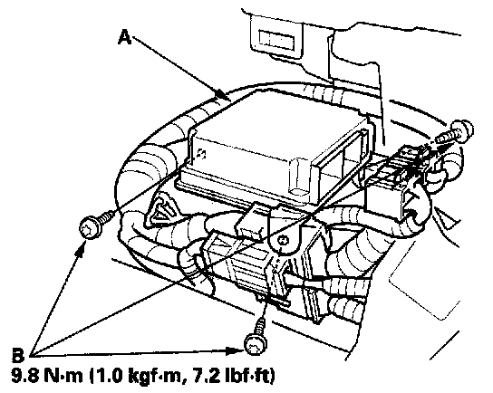 1. Install the new SRS unit (A) with Torx bolts (B), then connect the connectors to the SRS unit; push them into position until them clicks.