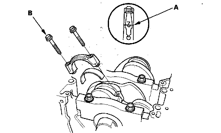 Apply new engine oil to the bolt threads and flanges. Torque the bolts (B) to 20 Nm (2.0 kgf-m, 14 ft. lbs.).