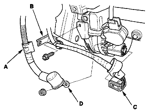 3. Install the harness bracket (C), then install the harness clamp (D).