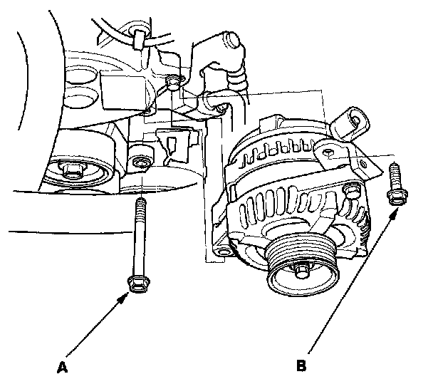 7. Remove the mounting bolt (A) and alternator bracket mounting bolt (B), then remove the alternator.