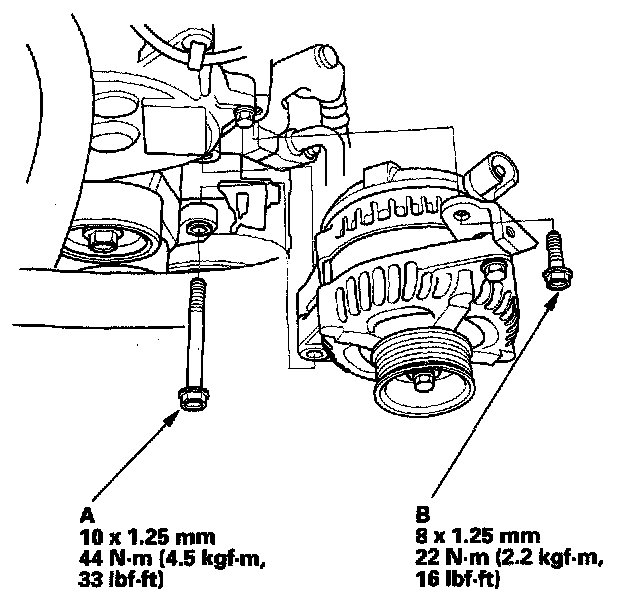 1. Install the alternator, and tighten the mounting bolt (A) and bracket mounting bolt (B).