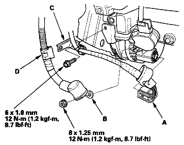 6. Disconnect the alternator connector (C) and the BLK wire (D) from the alternator.