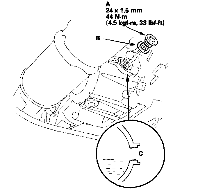 6. Refill the transfer assembly with the recommended fluid (hypoid gear oil) into the filler hole (C) until the fluid from flowing out. Use a SAE 90 or SAE 80W-90 viscosity hypoid gear oil, API classified GL4 or GL5 only.