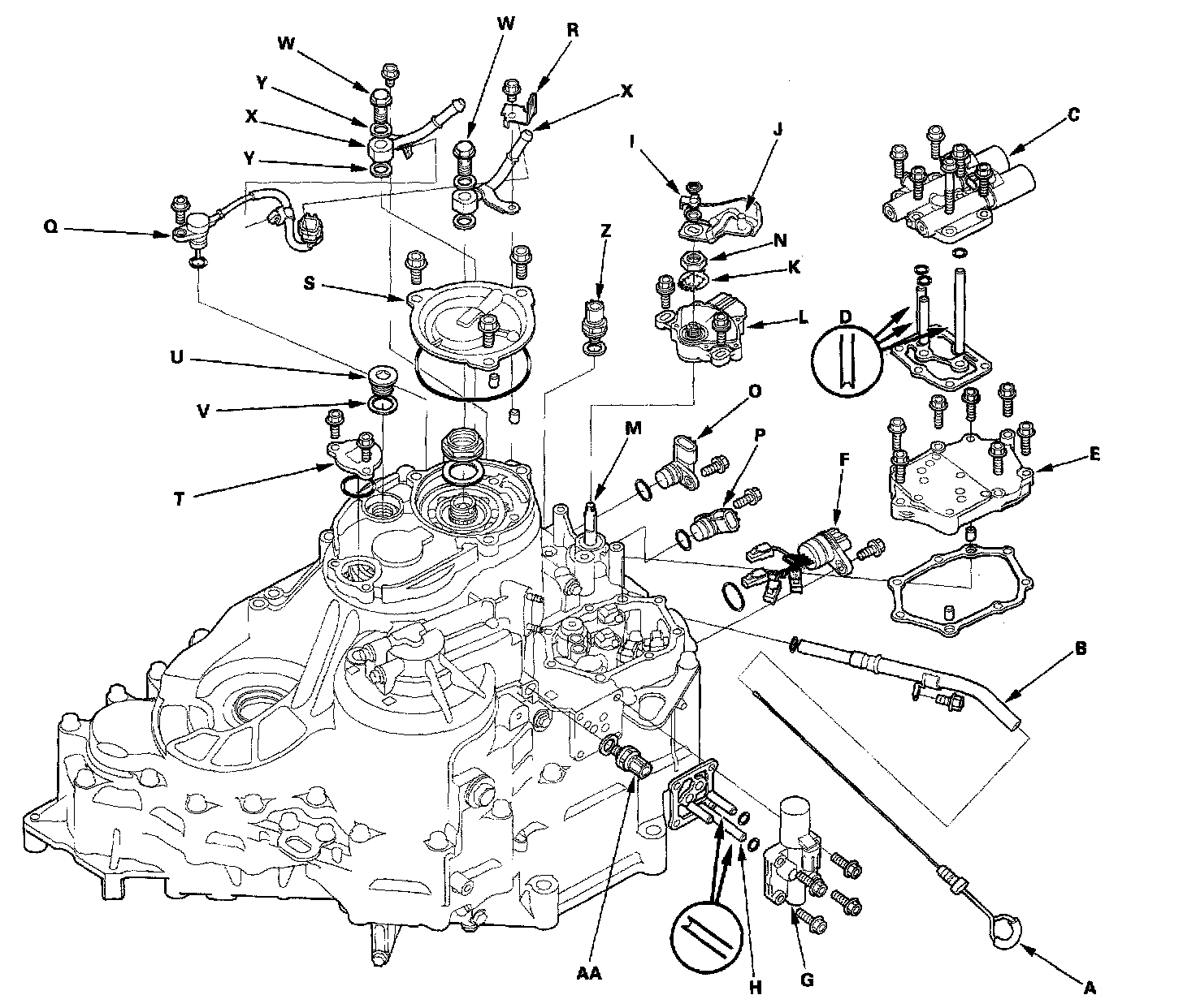 2. Remove the A/T clutch pressure control solenoid valve A and B (C) (six bolts), ATF feed pipes (D) (three), O-rings (three), and gasket.