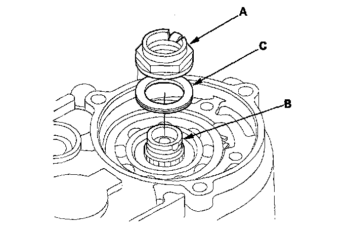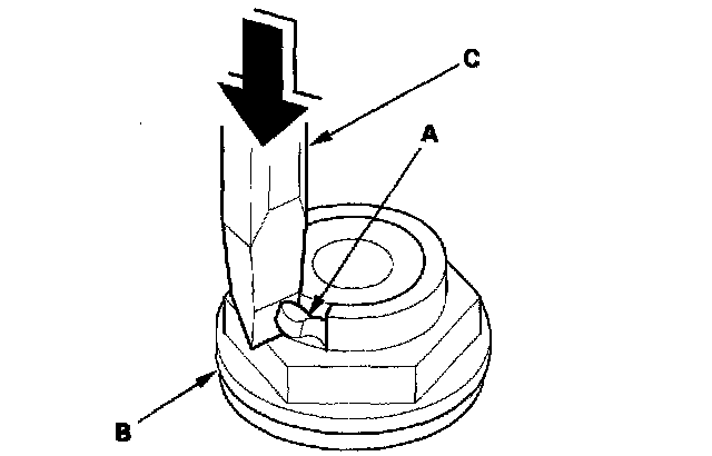 15. Cut the lock tab (A) of the mainshaft locknut (B) using a chisel (C).