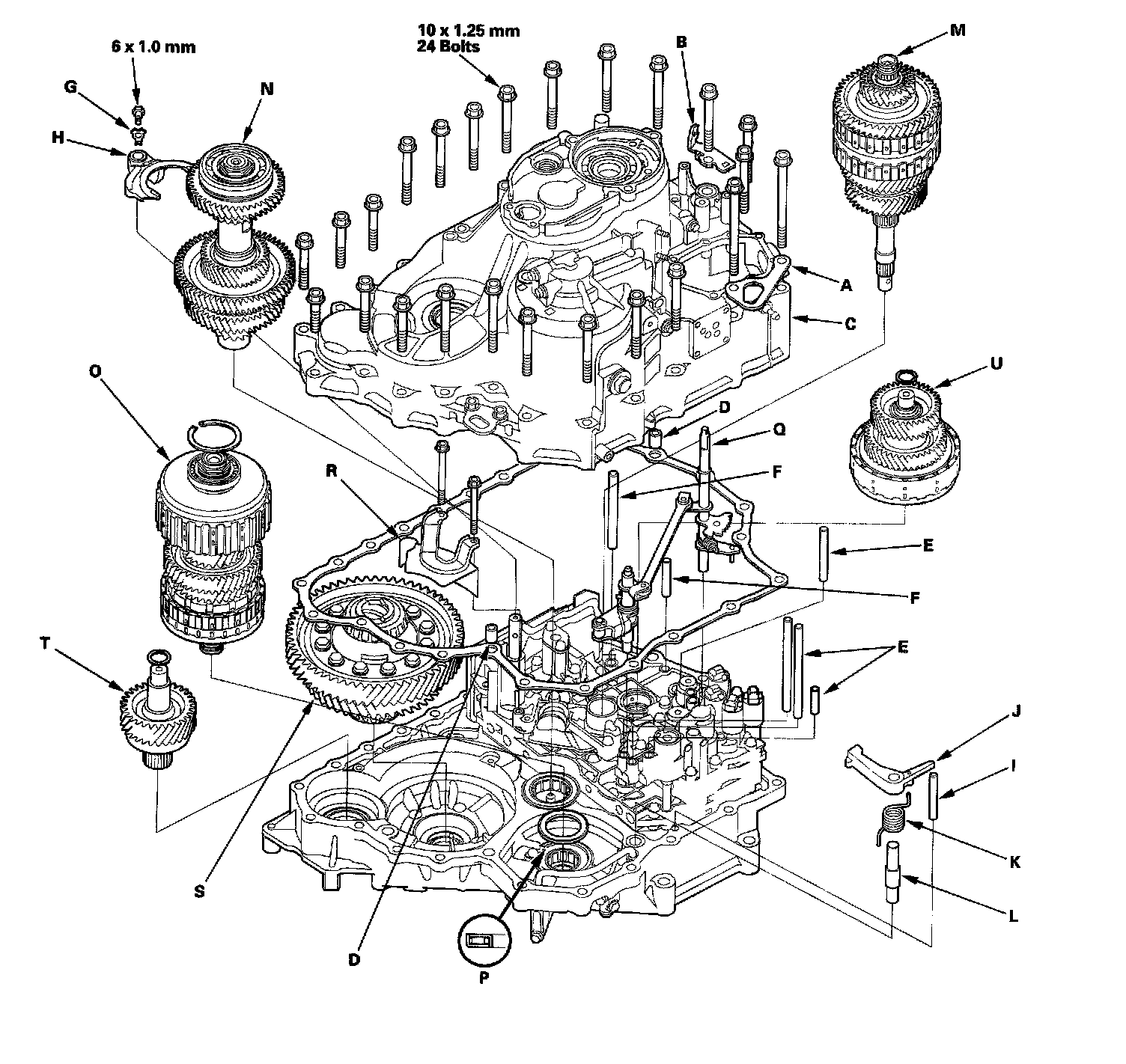 9. Remove the output shaft (countershaft) speed sensor (O), input shaft (mainshaft) speed sensor (P), ATF temperature sensor (Q), and the sensor harness clamp bracket (R).