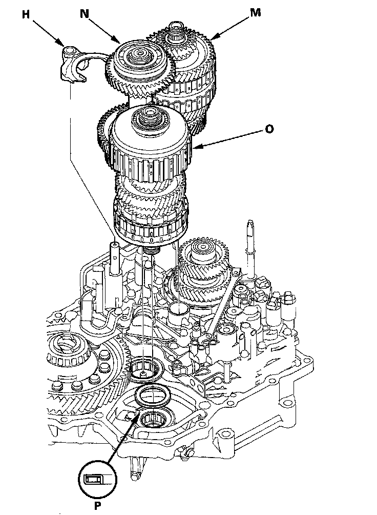 27. Remove the mainshaft (M), countershaft (N), shift fork (H), and secondary shaft (O) together, and remove the needle bearing (P) from the toque converter housing.