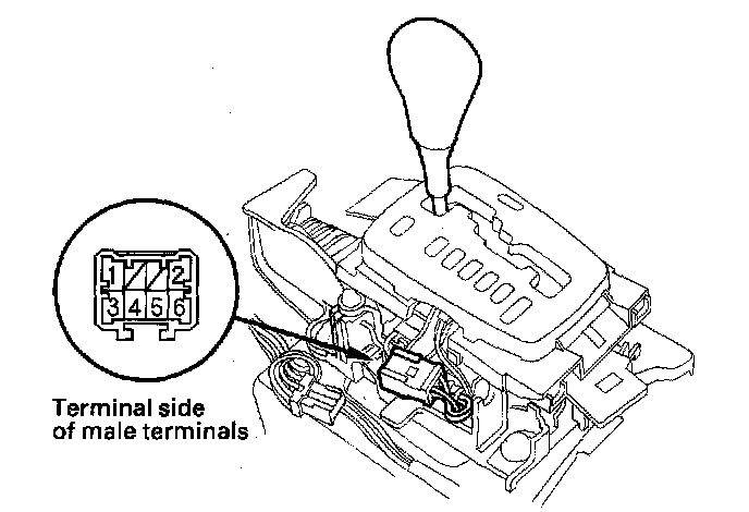 4. Shift the shift lever out of the P position, and check for continuity between the terminals in step 3. There should be no continuity.