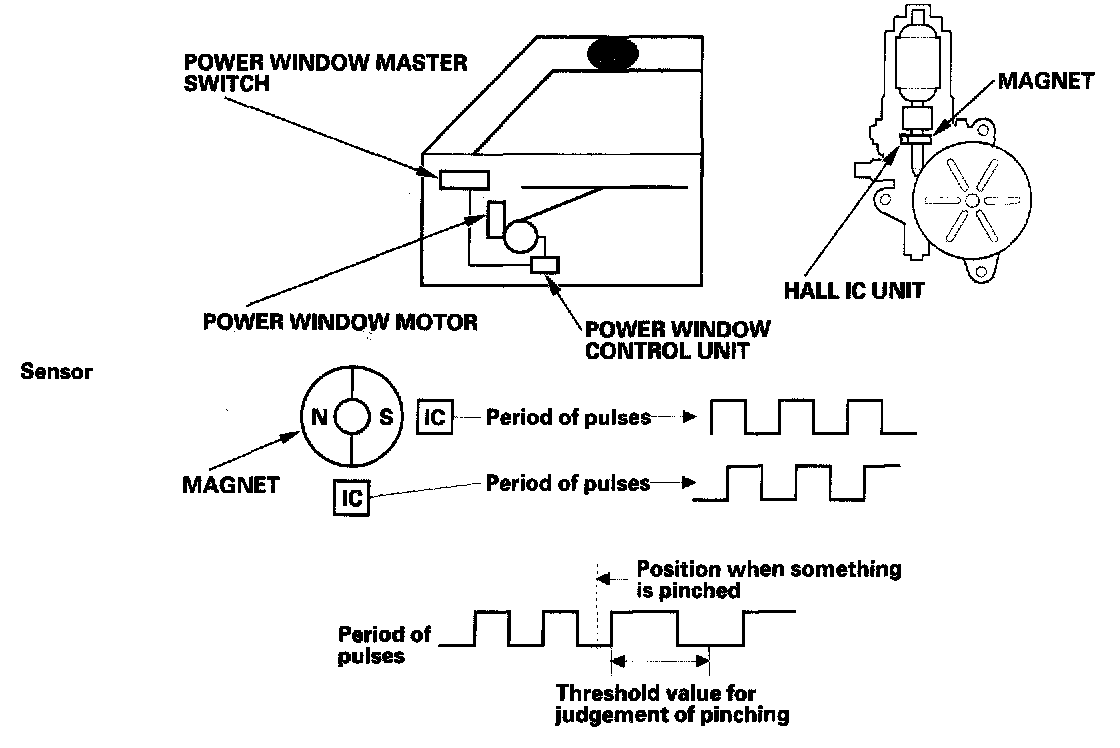 The system is composed of the power window master switch, the power window control unit and the driver's window motor. The power window motor incorporates a pulser which generates pulses during the motor's operation and sends the pulses to the power window control unit. As soon as the power window control unit detects no pulses from the pulser, the control unit makes the power window motor stop and reverse. This is to prevent pinching your hand or fingers during auto-up operation.
