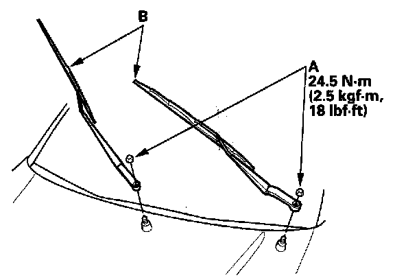 1. Remove the nuts (A) and the windshield wiper arms (B).