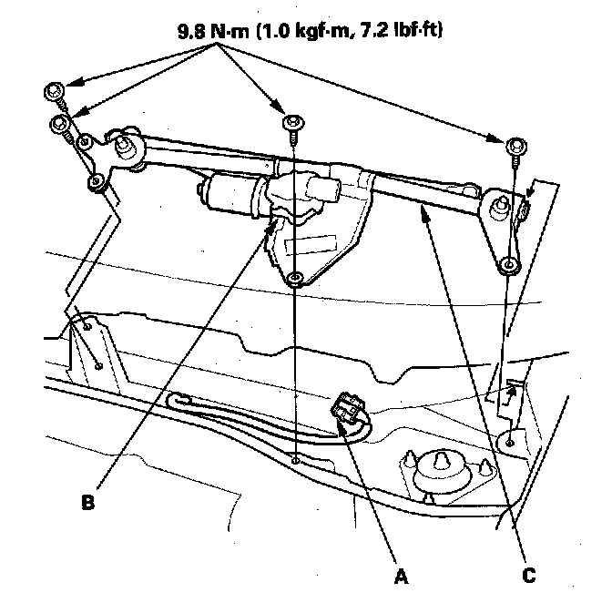 4. Remove the mounting bolts and the wiper linkage assembly (C).