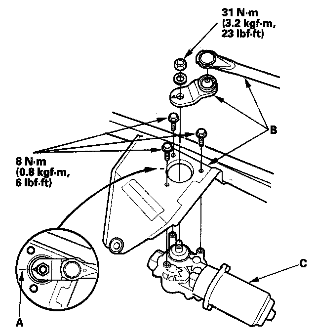 5. Scribe a line (A) across the link and windshield wiper linkage to show the original adjustment. Separate the windshield wiper linkage (B) from the wiper motor (C).