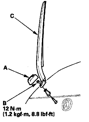 1. Remove the cap (A), mounting nut (B) and rear window wiper arm (C).